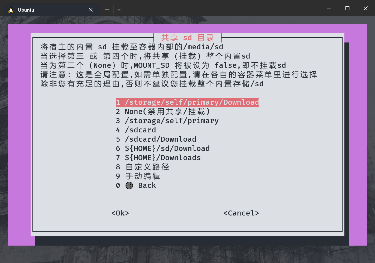 接下来需要挂载目录,选择一个合适的位置用做容器访问外部资源的目录